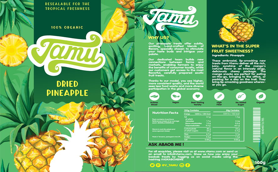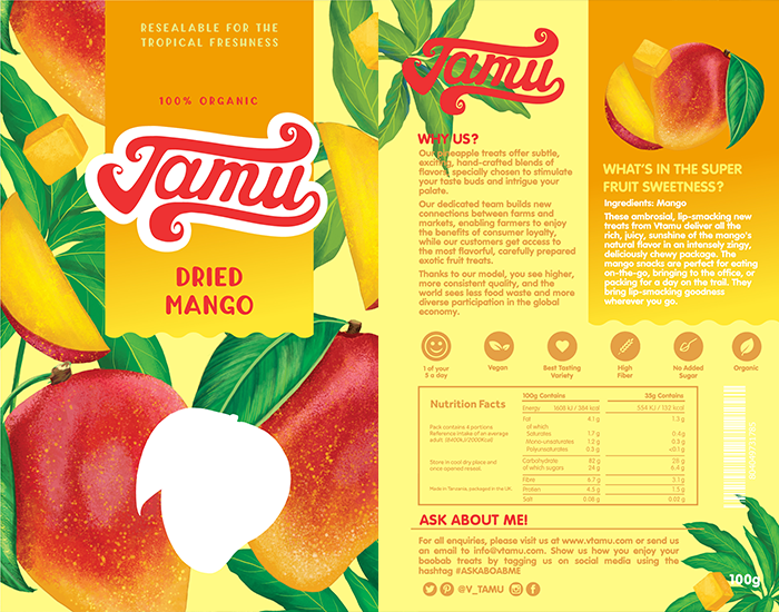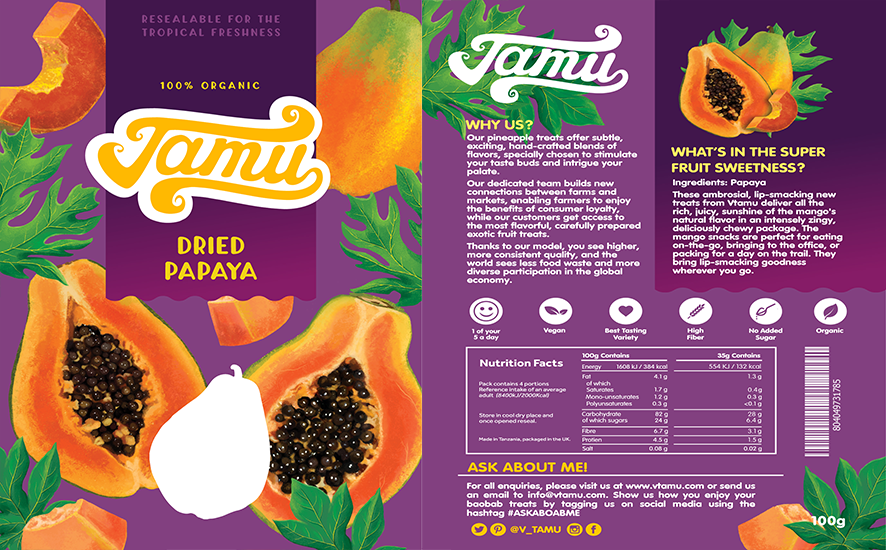 In order to extend shelf life and show the world what the farmers can offer, drying the products made more sense giving farmers access to overseas markets. Vtamu approached us to create packaging for their dried fruit range.